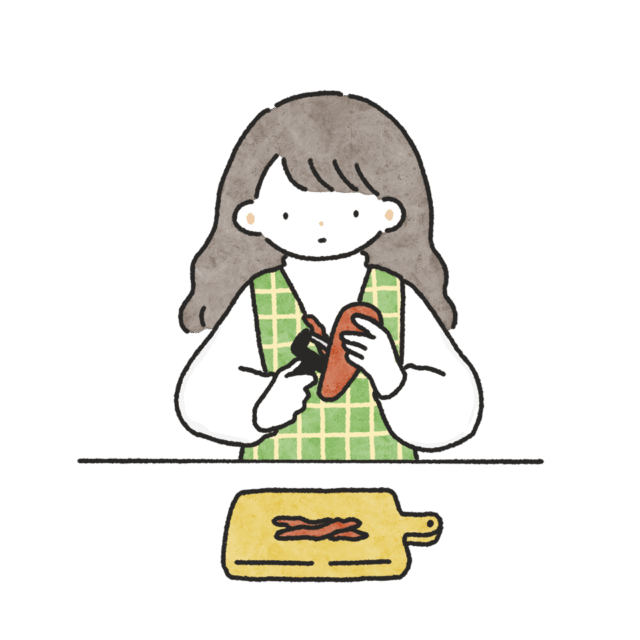 まな板の上でカボチャを丸ごと包丁で切ろうとしているエプロンをした女性の手描きタッチフリーイラスト素材